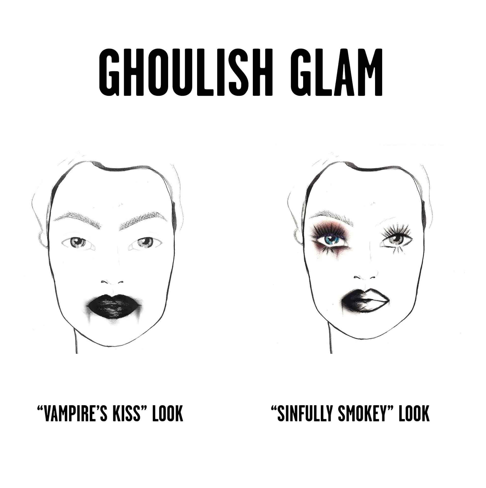 The “Vampire’s Kiss” features a wicked black lip with bloody accents to entice the most horrifying of fanged creatures, while the “Sinfully Smokey” includes a winged liner with glitter accents and a kissable dark half-lip.