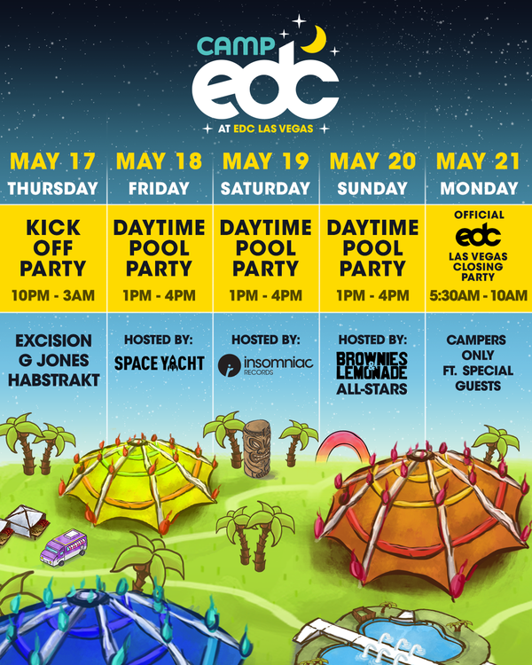 Camp EDC festivities will open exclusively to camping ticketholders on Thursday, May 17 at 3 p.m. Headliners will spread love, create new friendships and unite as a community under the Three Mountains.