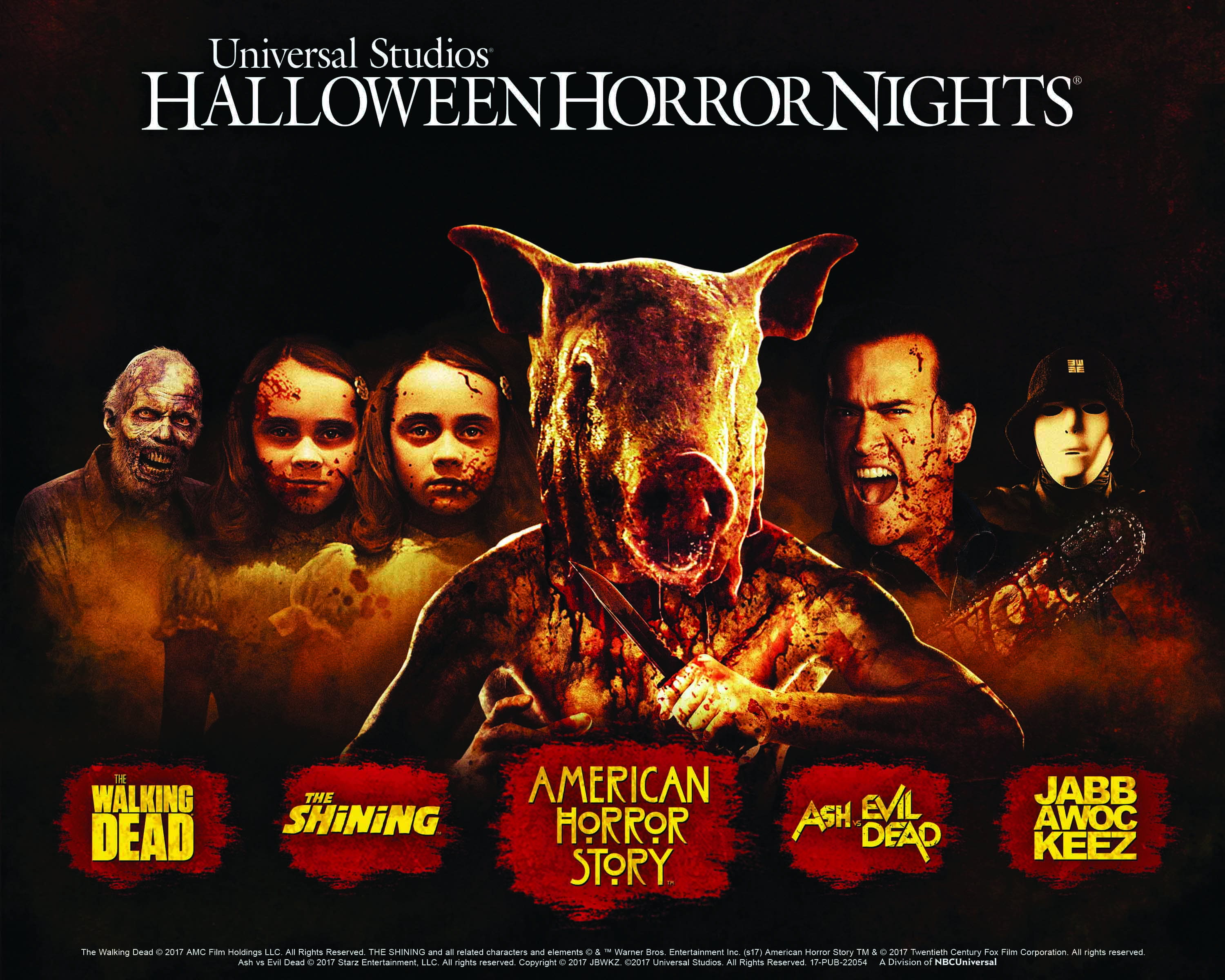 Touting more mazes than ever, this year’s Halloween Horror Nights” lineup includes: The Shining, inspired by Stanley Kubrick’s psychological thriller; “American Horror Story: Roanoke,” based on FX’s critically-acclaimed, Emmy and Golden Globe Award-winning television series; “The Horrors of Blumhouse,” featuring iconic and unnerving moments from The Purge franchise, Sinister movies and upcoming Happy Death Day, inspired by prolific filmmaker Jason Blum’s blockbuster films; “Insidious: Beyond the Further,” based on Universal Pictures and Sony Picture’s upcoming supernatural thriller Insidious franchise including, Insidious: The Last Key; “Ash vs. Evil Dead,” based on Starz’s comedy horror television series; “SAW: The Games of Jigsaw,” inspired by the SAW film series and the upcoming series installment, JIGSAW; “Titans of Terror,” which unites slasher film villains, Freddy Krueger, Jason Voorhees and Leatherface; and “The Walking Dead” attraction inspired by AMC’s record-breaking television series.